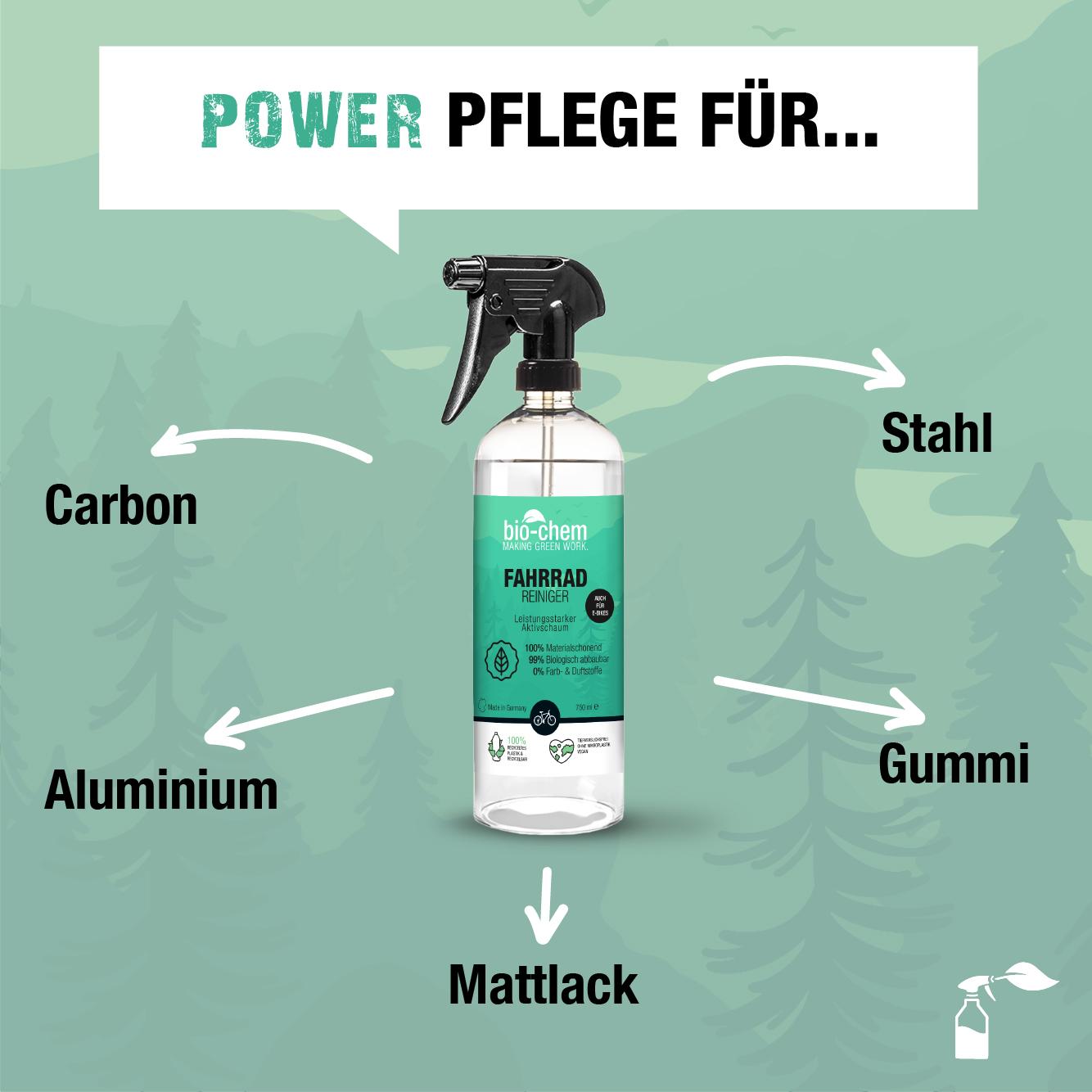Einsprühen, wenige Minuten einwirken lassen und mit Wasser abspülen. Schon glänzt Dein Bike wie neu